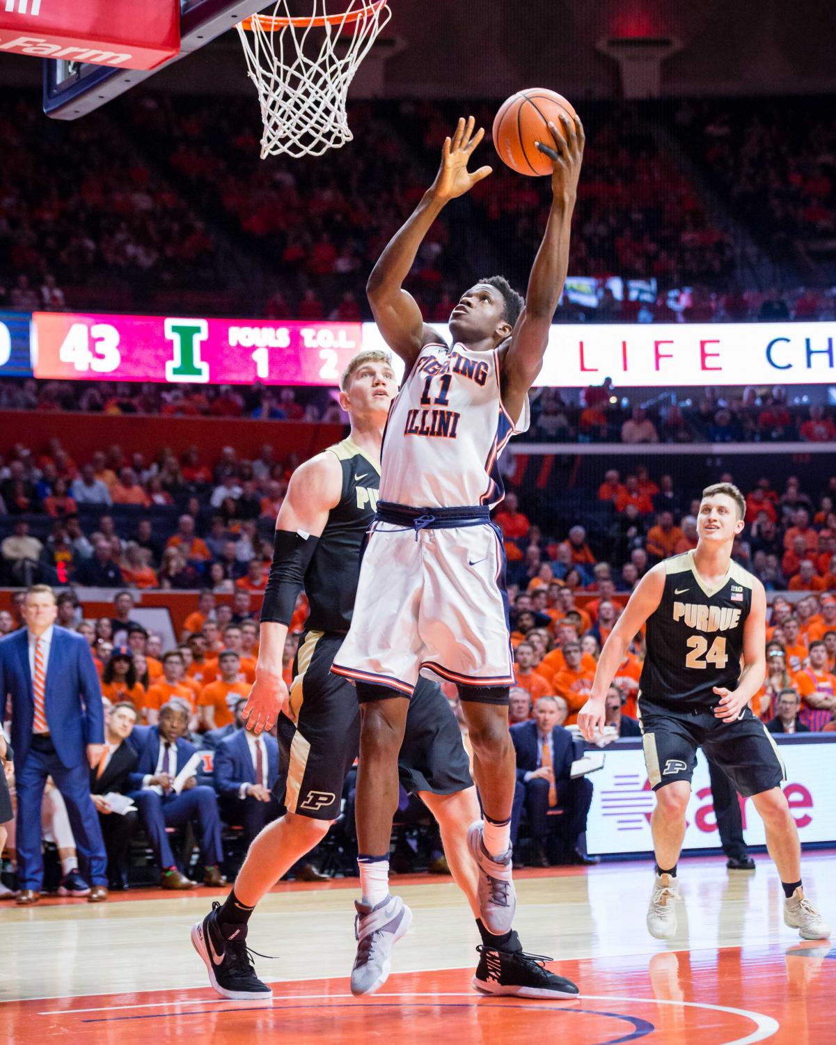 Illinois forward Greg Eboigbodin (11) puts up a layup during the game against Purdue at the State Farm Center on Thursday, Feb. 22, 2018. The Illini lost 93-86.