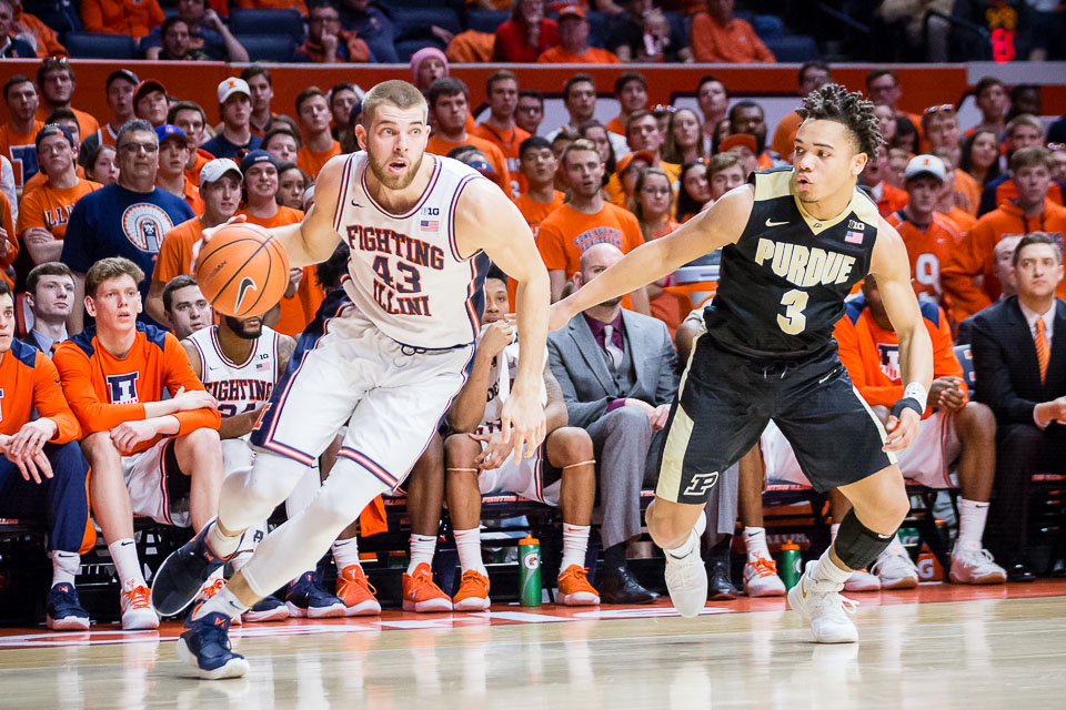 Illinois forward Michael Finke (43) dribbles to the basket during the game against Purdue at the State Farm Center on Thursday, Feb. 22, 2018.