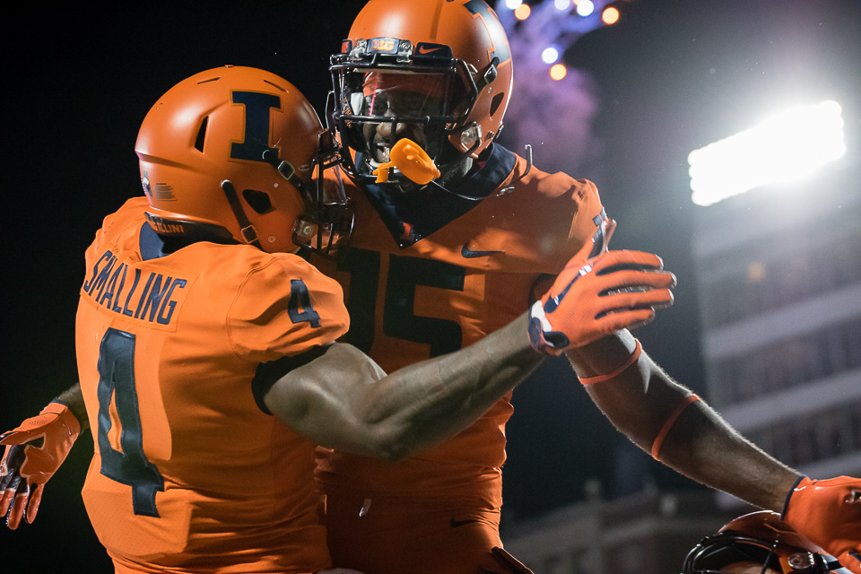 Illinois wide receiver Ricky Smalling (left) celebrates with wide receiver Trenard Davis (right) after scoring a touchdown during the game against Penn State at Memorial Stadium on Friday. The Illini lost 63-24.