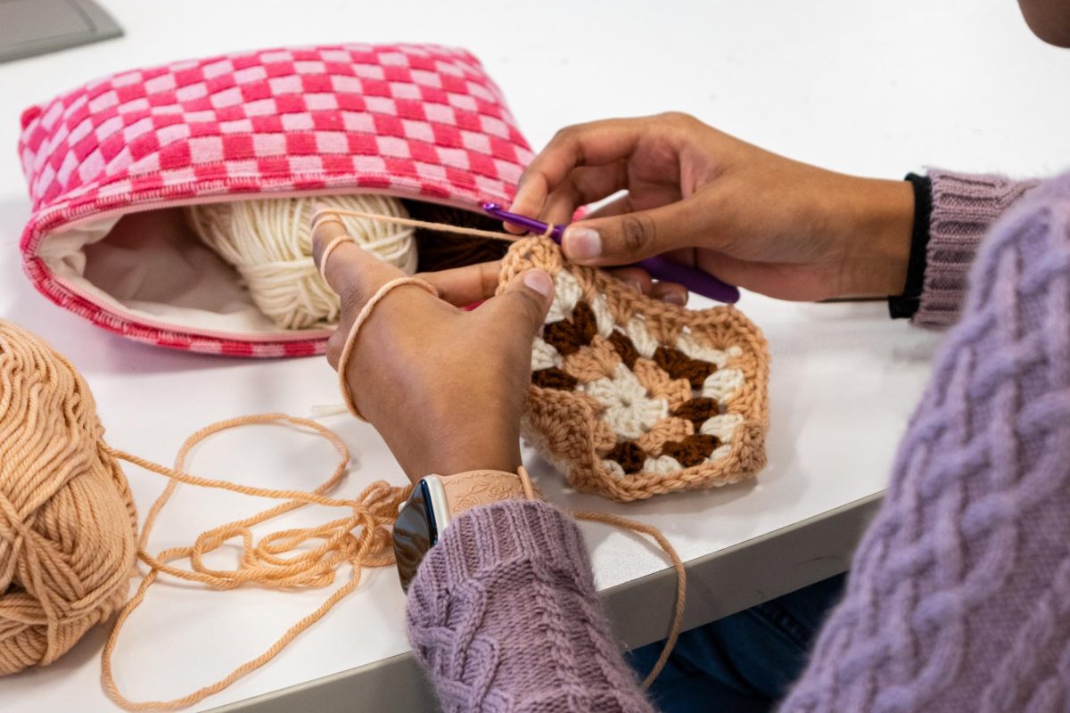 Many members are self-taught, having learned to knit or crochet during the COVID-19 “craft era.” However, club president Rylee Hanlon, junior in Engineering, noted that while online tutorials are great resources, it can be hard to observe techniques due to camera angles and hand movements.