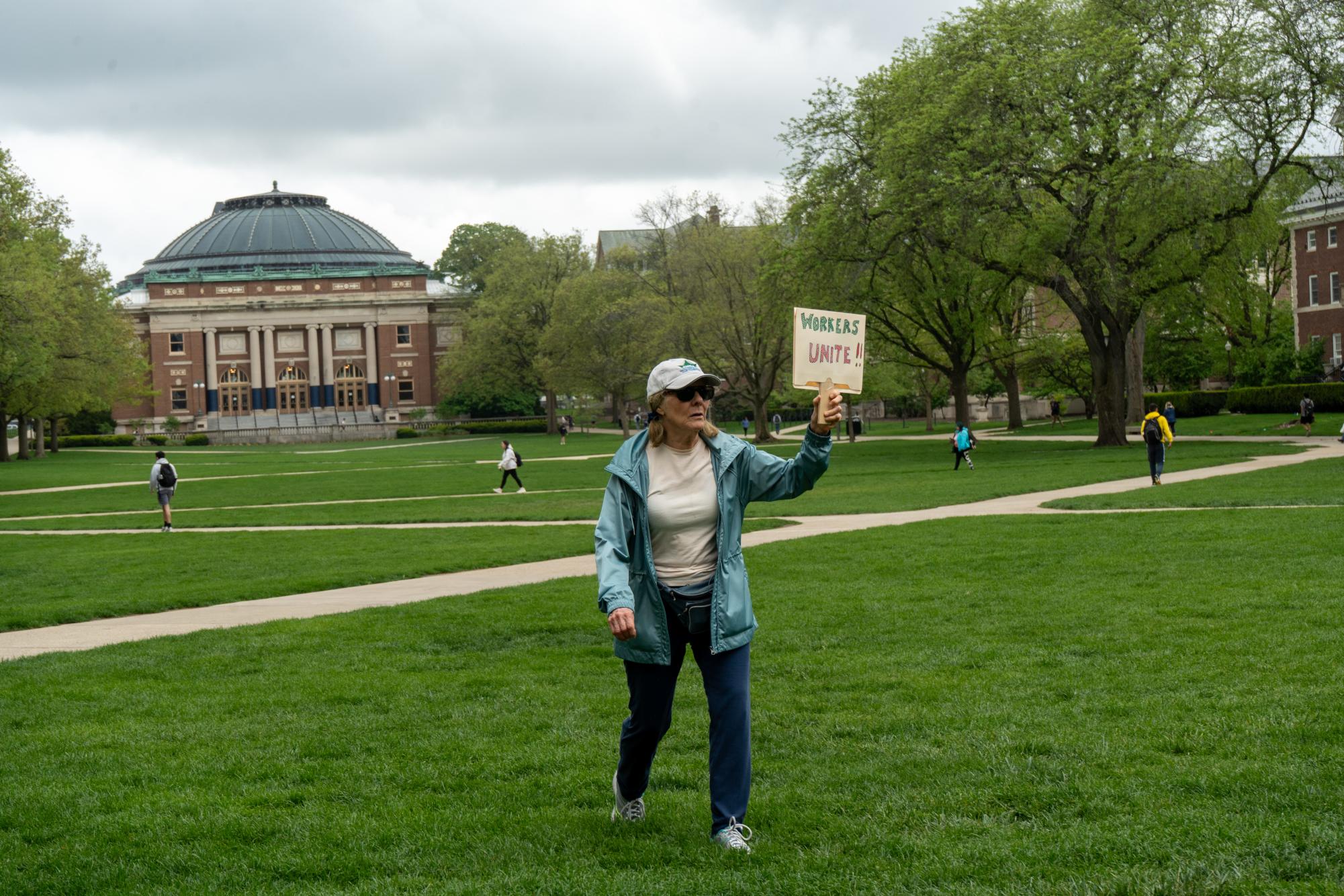 The sounds of chants, trumpets and speeches marked the anniversary remembrance of the 1886 Haymarket Affair on campus. The Non-Tenure Faculty Coalition, Graduate Employees’ Organization and Service Employees International Union rallied to celebrate workers on campus and international students’ and workers’ rights.