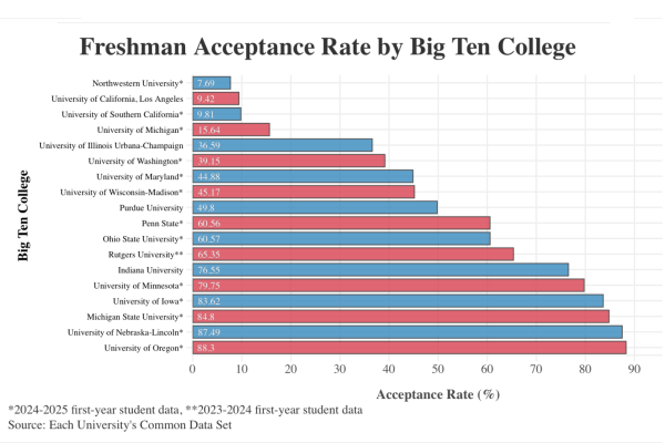 Freshman acceptance rates by Big Ten universities, based on Common Data Set figures. Northwestern University recorded the lowest rate, while the University of Oregon was the highest. The University of Illinois ranks as the fifth most selective overall. (Rikkie Gunawan and Ryan Pearlman)