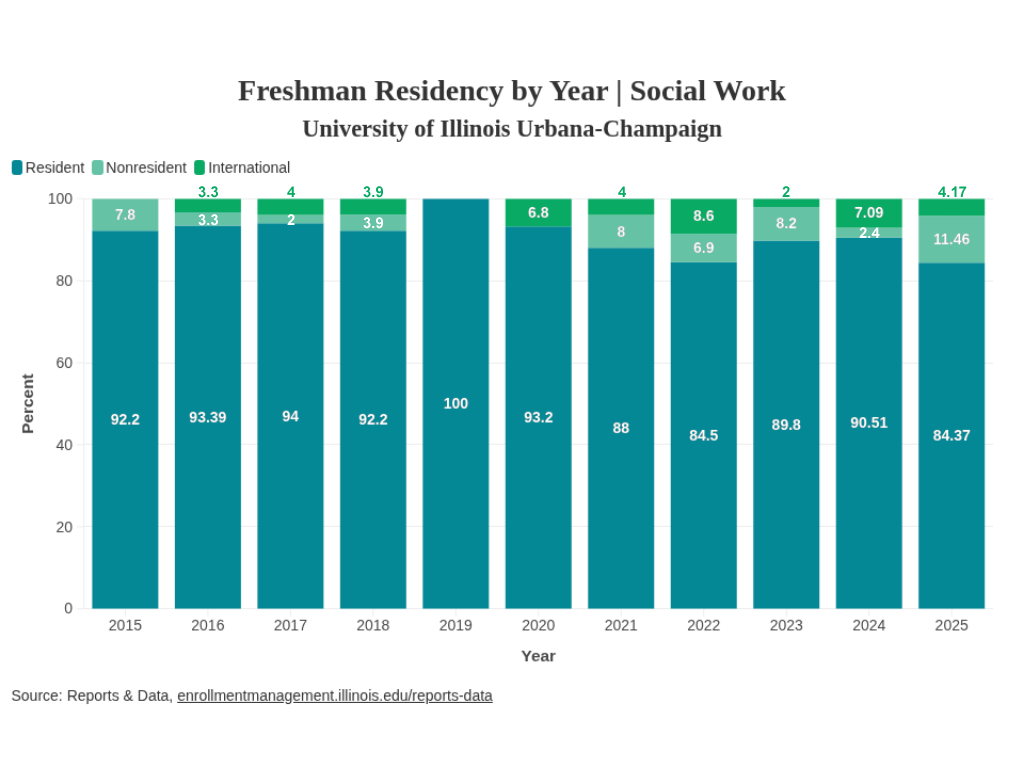 Freshman residency in the School of Social Work by status, 2015-2025. (Rikkie Gunawan and Ryan Pearlman)