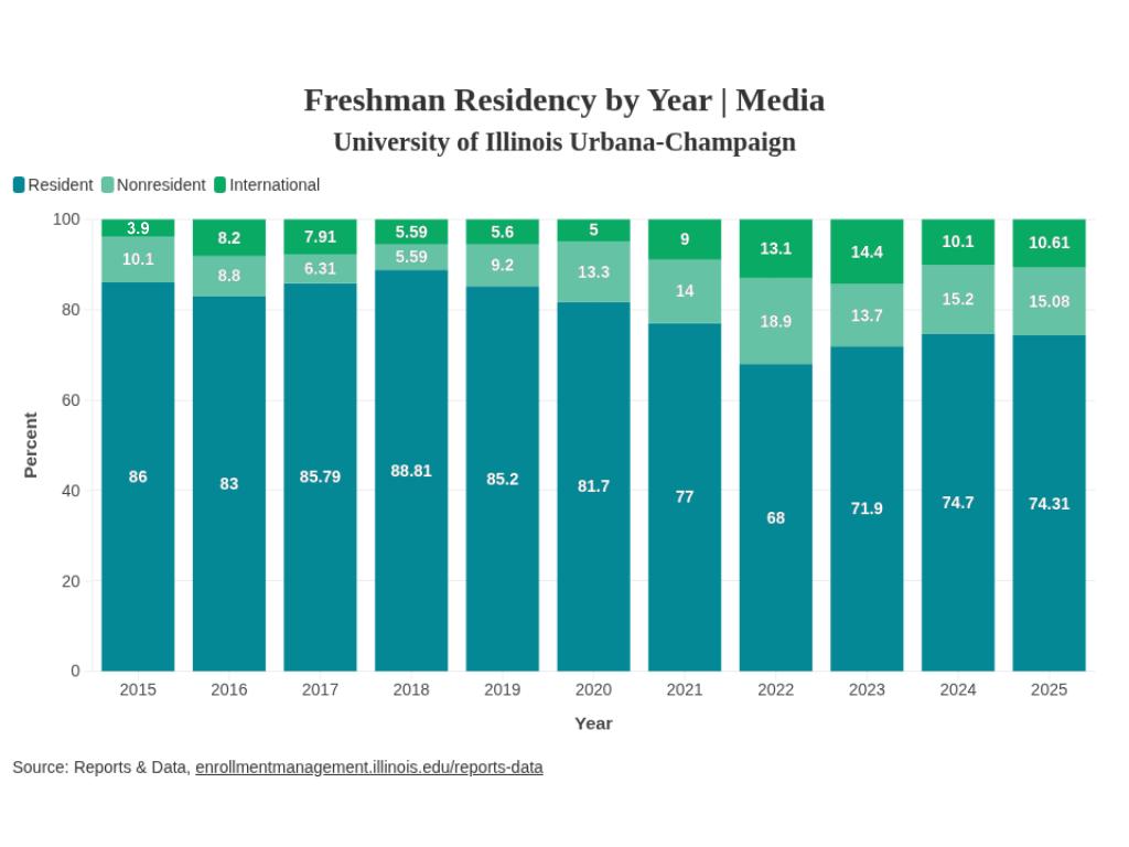Freshman residency in the College of Media by status, 2015-2025. (Rikkie Gunawan and Ryan Pearlman)