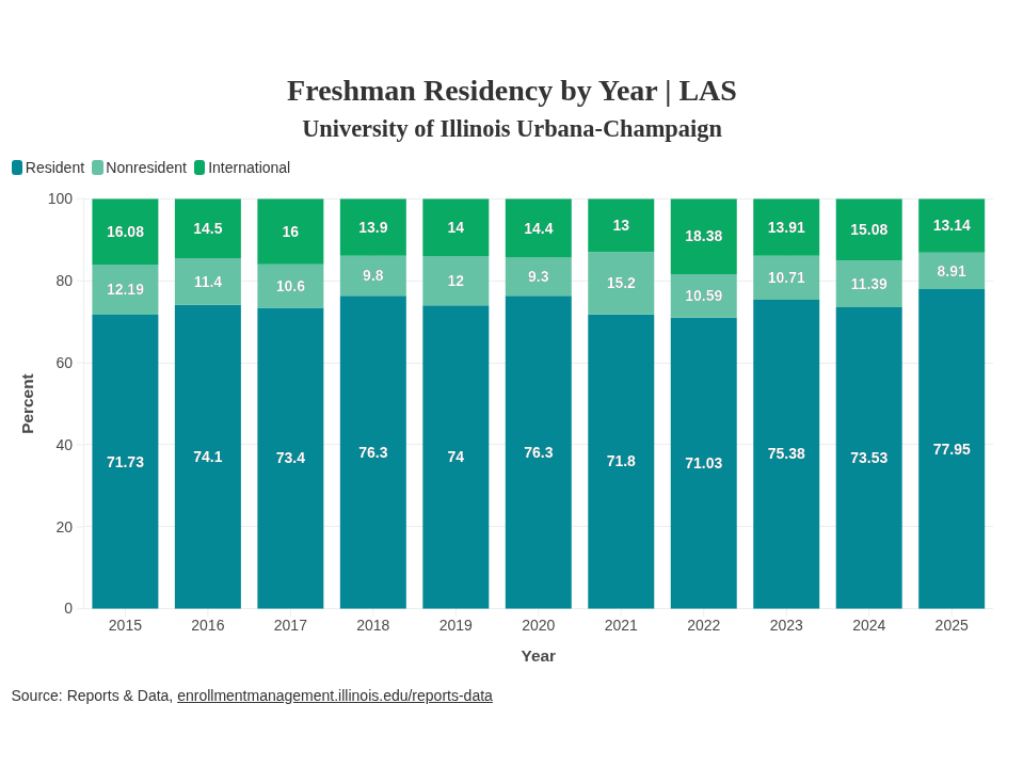 Freshman residency in the College of Liberal Arts and Sciences by status, 2015-2025. (Rikkie Gunawan and Ryan Pearlman)