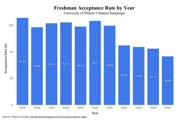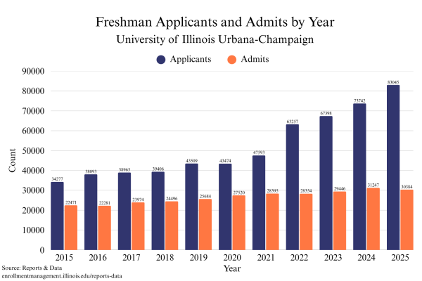 Freshman applicants and admits at the University from 2015 to 2025, with admissions holding steady between about 22,000 and 32,000 while applications surged from 34,000 to over 83,000. (Rikkie Gunawan and Ryan Pearlman)Freshman acceptance rate at the University from 2015 to 2025, dropping from about 66% in 2015 to just under 37% in 2025. (Rikkie Gunawan and Ryan Pearlman)