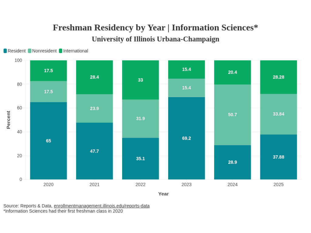Freshman residency in the School of Information Sciences by status, 2020-2025. (Rikkie Gunawan and Ryan Pearlman)
