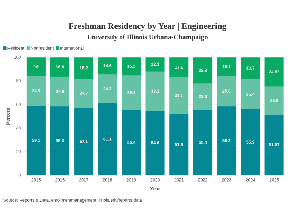Freshman residency in the Grainger College of Engineering by status, 2015-2025. (Rikkie Gunawan and Ryan Pearlman)