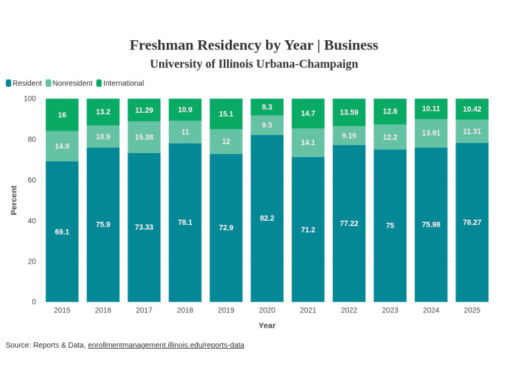 Freshman residency in the Gies College of Business by status, 2015-2025. (Rikkie Gunawan and Ryan Pearlman)