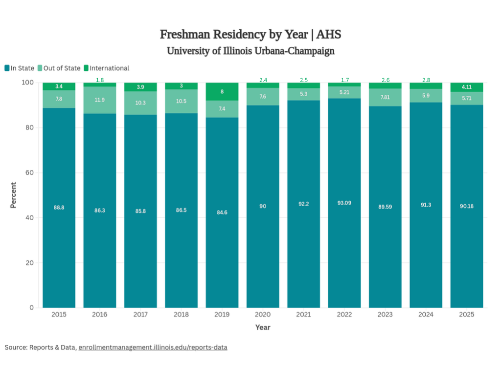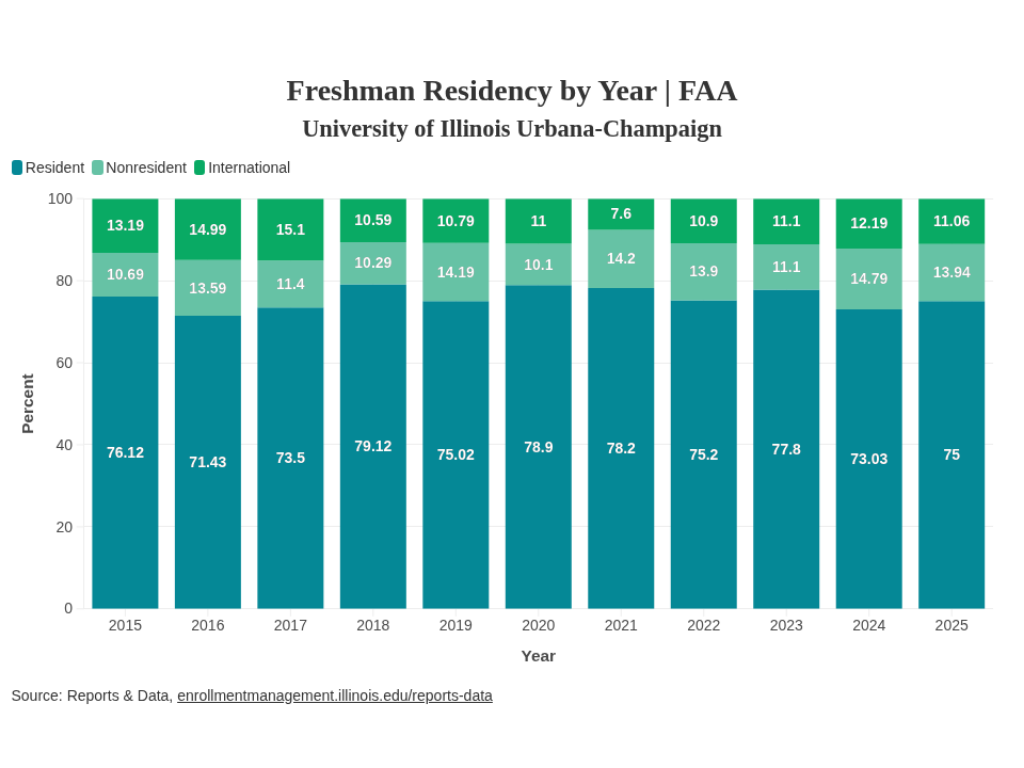 Freshman residency in the College of Fine and Applied Arts by status, 2015-2025. (Rikkie Gunawan and Ryan Pearlman)