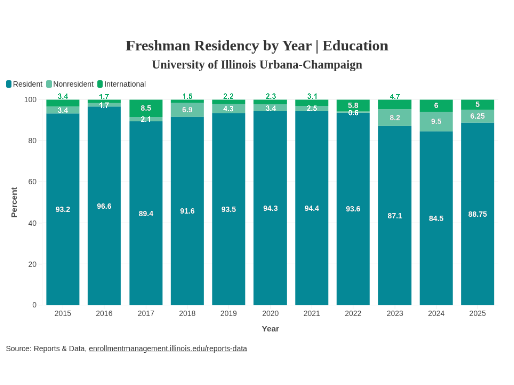 Freshman residency in the College of Education by status, 2015-2025. (Rikkie Gunawan and Ryan Pearlman)