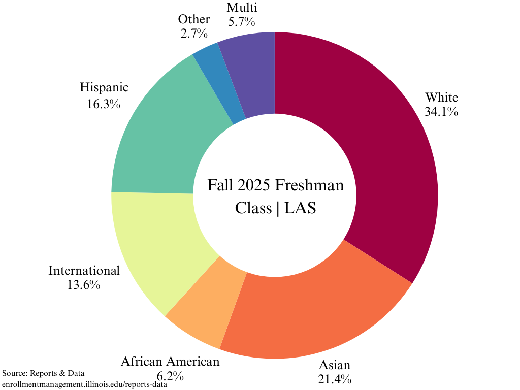 Fall 2025 freshman class demographics in the College of Liberal Arts & Sciences. (Rikkie Gunawan and Ryan Pearlman)