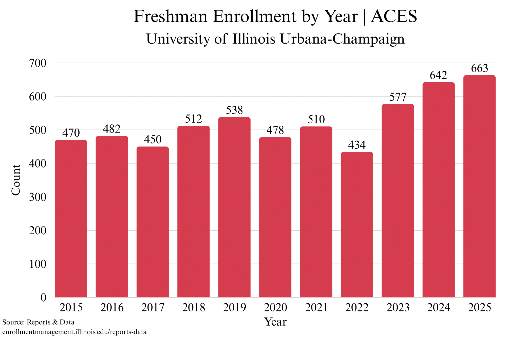 First-year enrollment in the College of Agricultural, Consumer and Environmental Sciences, 2015–2025. (Rikkie Gunawan and Ryan Pearlman)