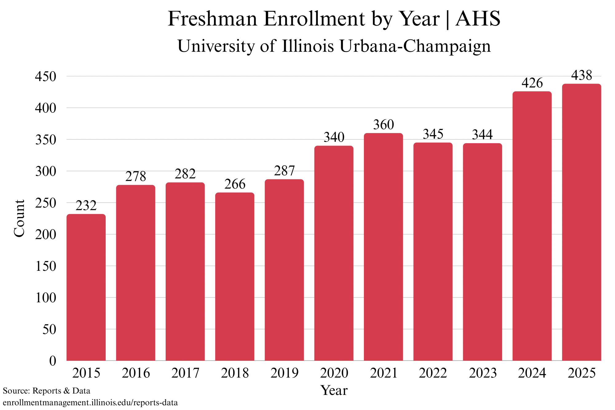 First-year enrollment in the College of Applied Health Sciences, 2015–2025. (Rikkie Gunawan and Ryan Pearlman)