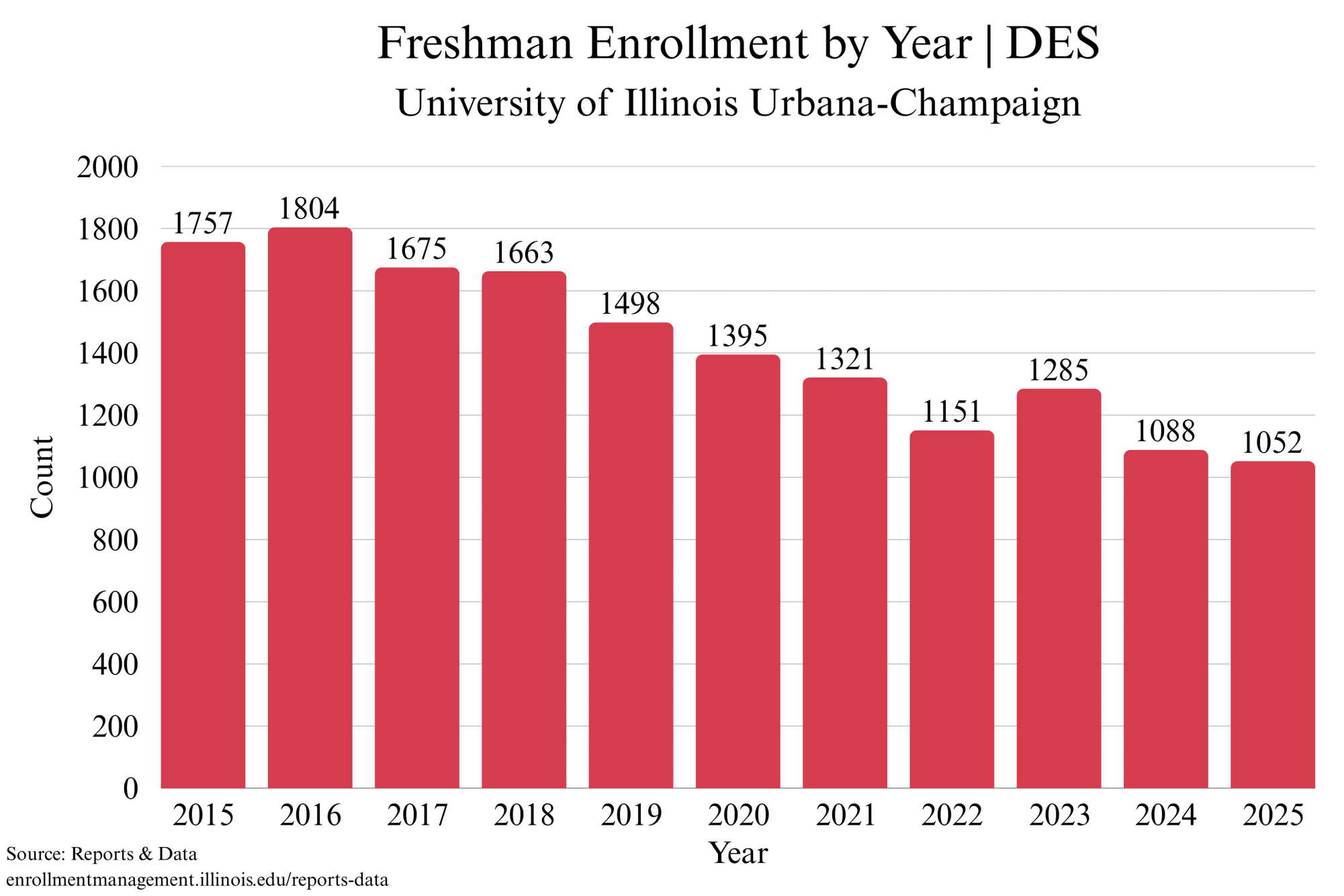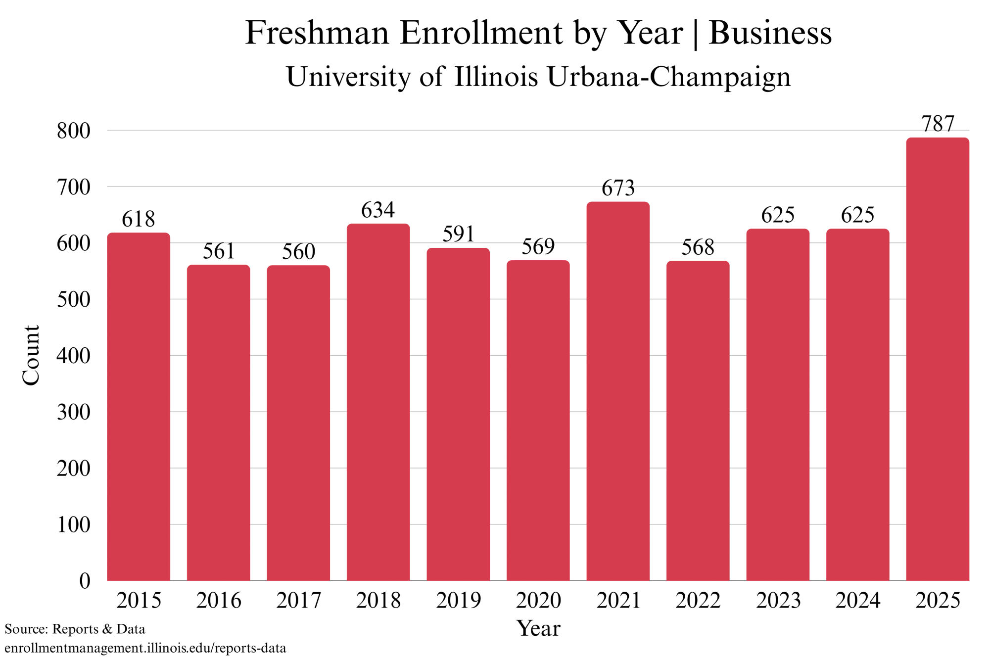 First-year enrollment in the Gies College of Business, 2015–2025. (Rikkie Gunawan and Ryan Pearlman)