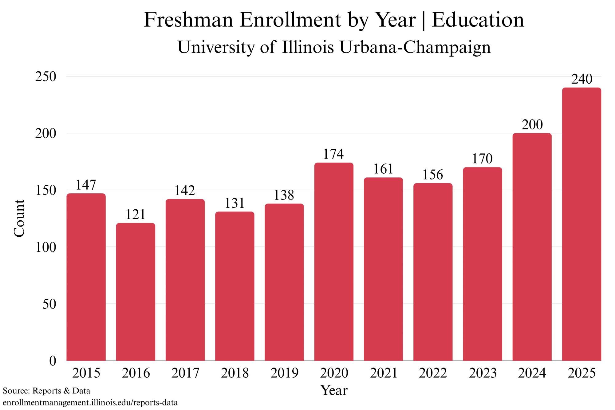 First-year enrollment in the College of Education, 2015–2025. (Rikkie Gunawan and Ryan Pearlman)