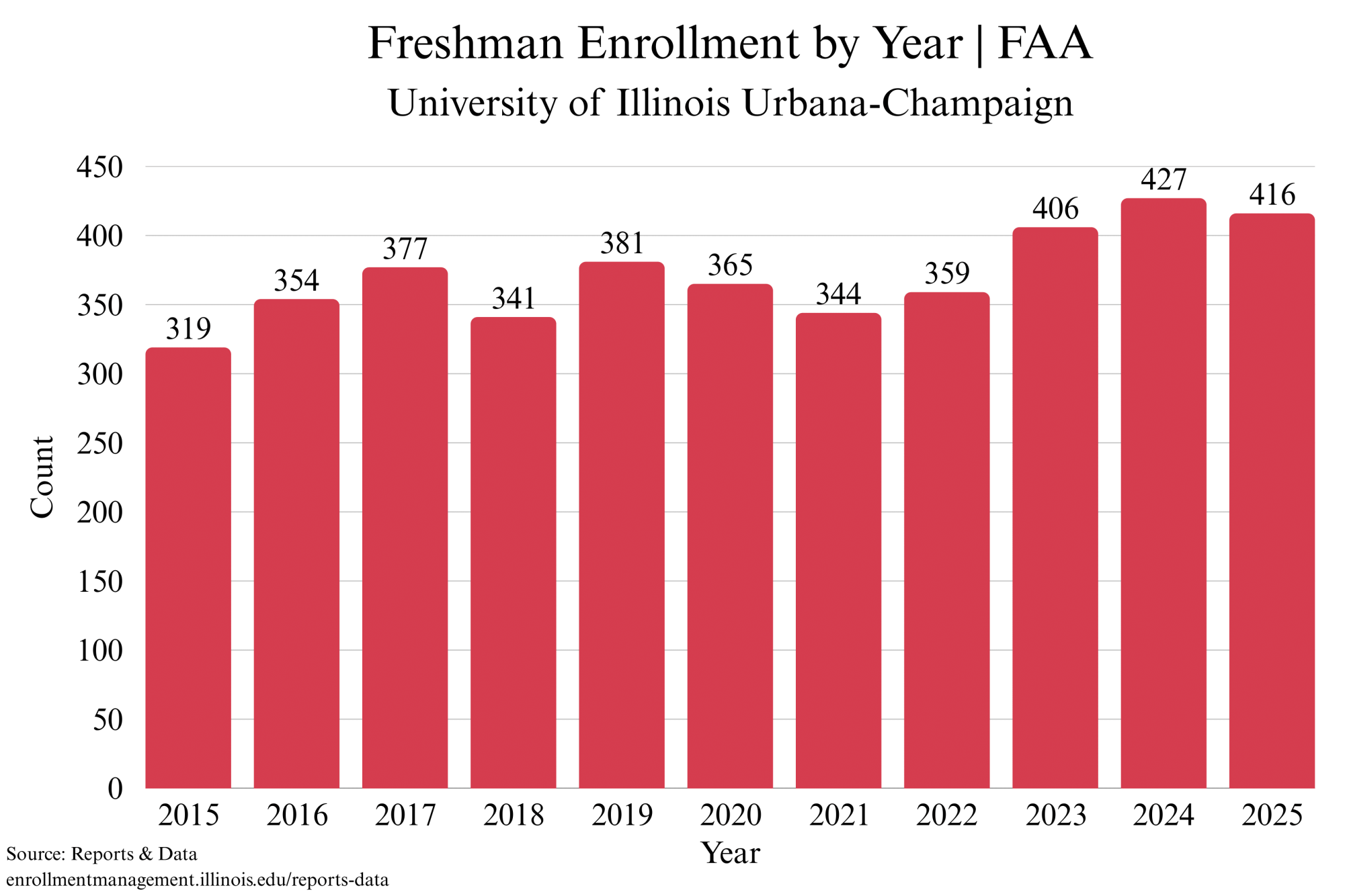 First-year enrollment in the College of Fine & Applied Arts, 2015–2025. (Rikkie Gunawan and Ryan Pearlman)