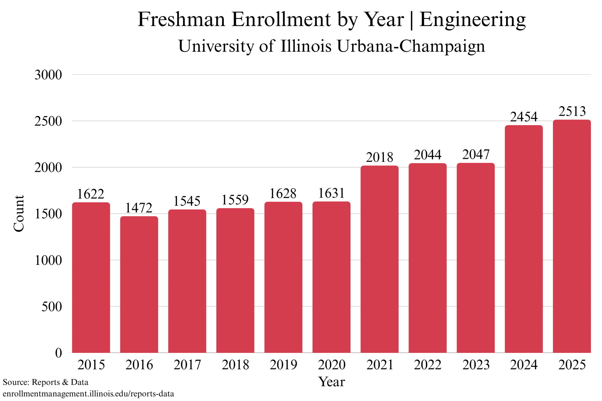First-year enrollment in the Grainger College of Engineering, 2015–2025. (Rikkie Gunawan and Ryan Pearlman)