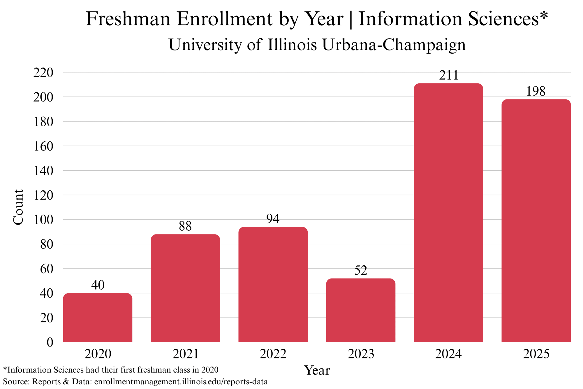 First-year enrollment in the School of Information Sciences, 2020–2025. (Rikkie Gunawan and Ryan Pearlman)