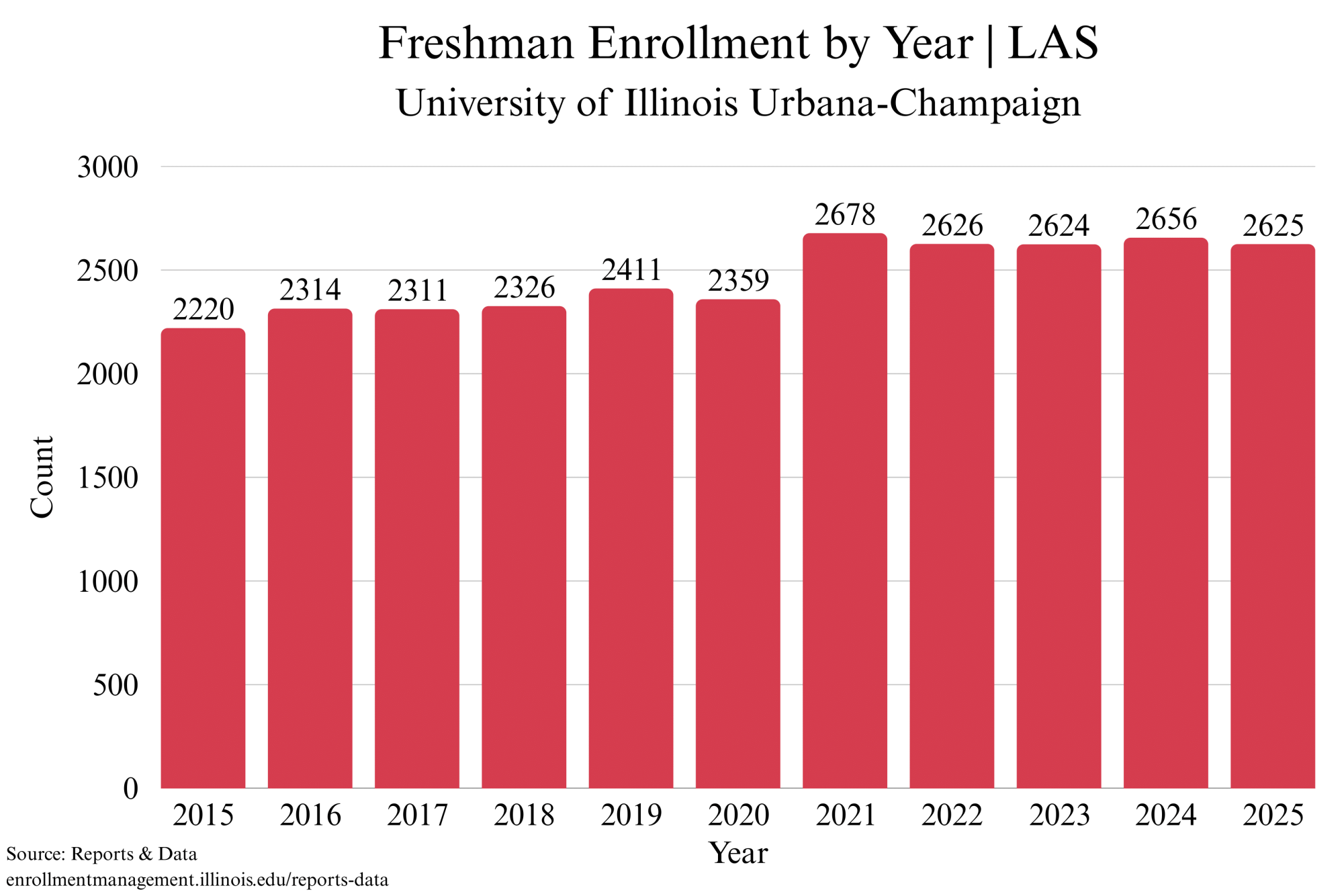 First-year enrollment in the College of Liberal Arts & Sciences, 2015–2025. (Rikkie Gunawan and Ryan Pearlman)