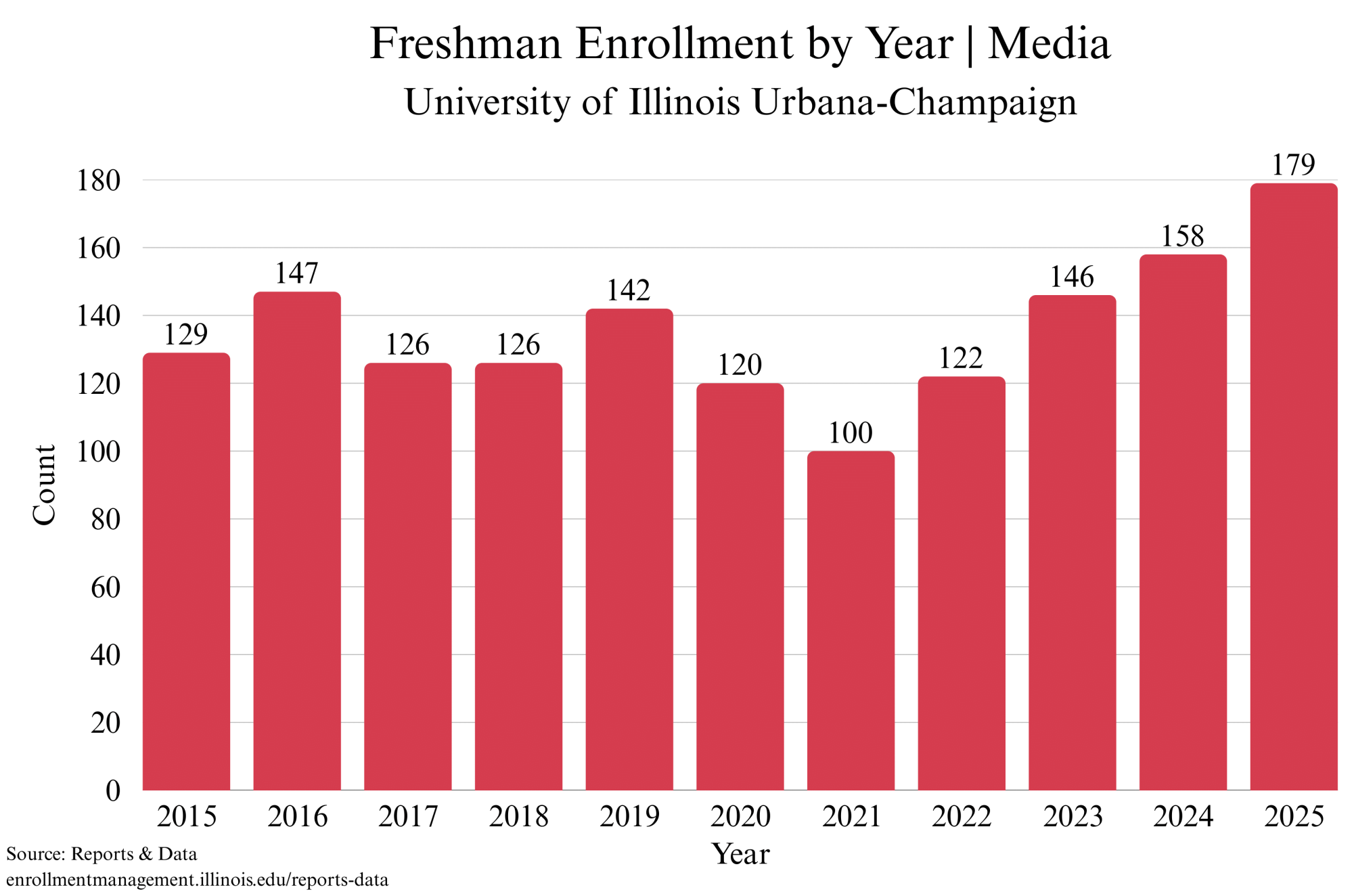 First-year enrollment in the College of Media, 2015–2025. (Rikkie Gunawan and Ryan Pearlman)