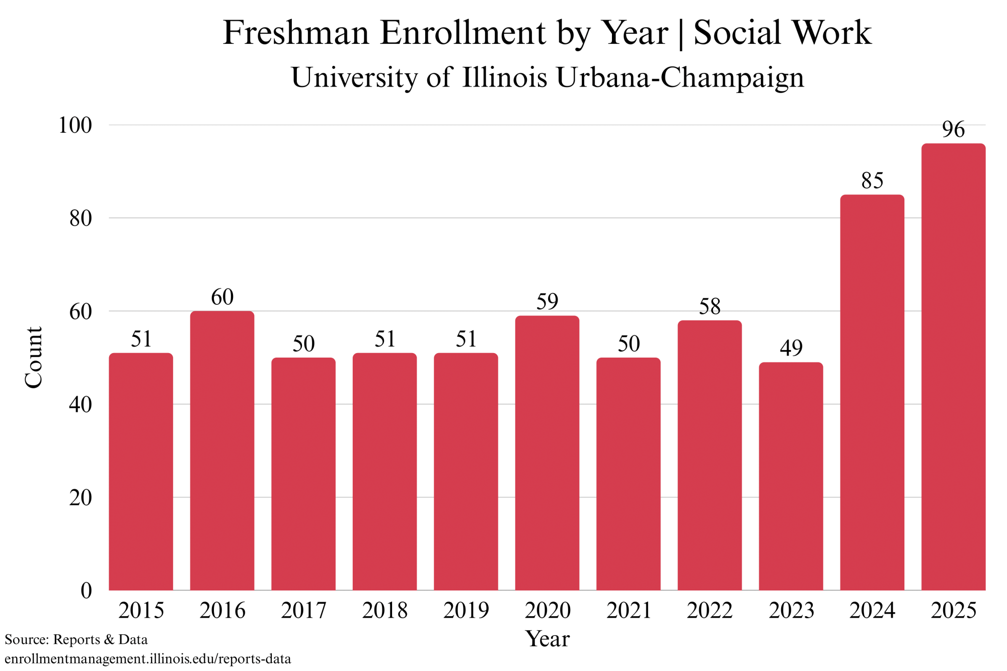 First-year enrollment in the School of Social Work, 2015–2025. (Rikkie Gunawan and Ryan Pearlman)