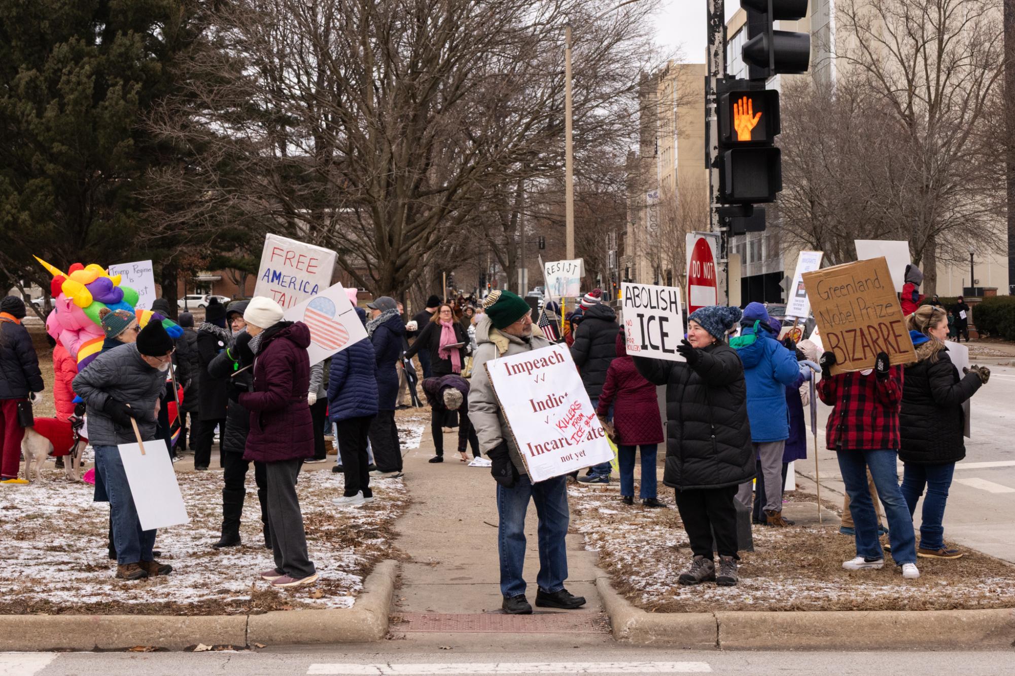 Equipped with buttons, handwarmers and signs with anti-Trump, anti-ICE and anti-war slogans, protestors marched in loops around the park as cars driving by honked in support.