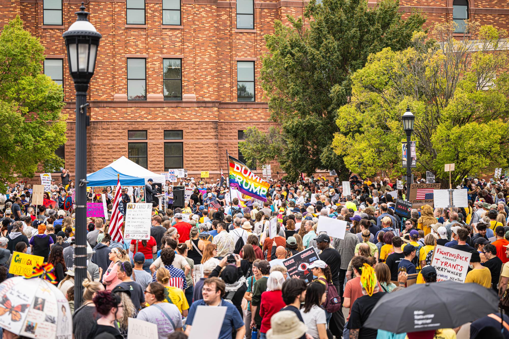 In June 2025, thousands gathered in Urbana for the first local event, rallying and marching through downtown. Protesters carried signs, waved flags and listened to speeches condemning the Trump administration and what speakers described as growing authoritarianism.