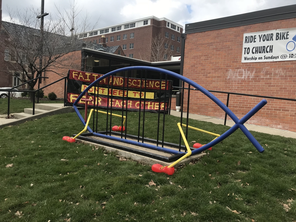 The bike rack in front of St. Andrew’s Lutheran Campus Center added Darwin feet, a symbol representing the theological perspective of evolution, to signify that faith and science can be mutually respectful.