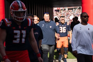 The Illini run up to their teammate, junior running back Josh McCray, after he makes a touchdown.