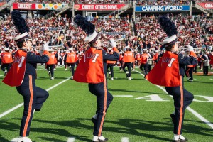 The Marching Illini trumpets play on the Camping World Stadium field for the pregame band performance.