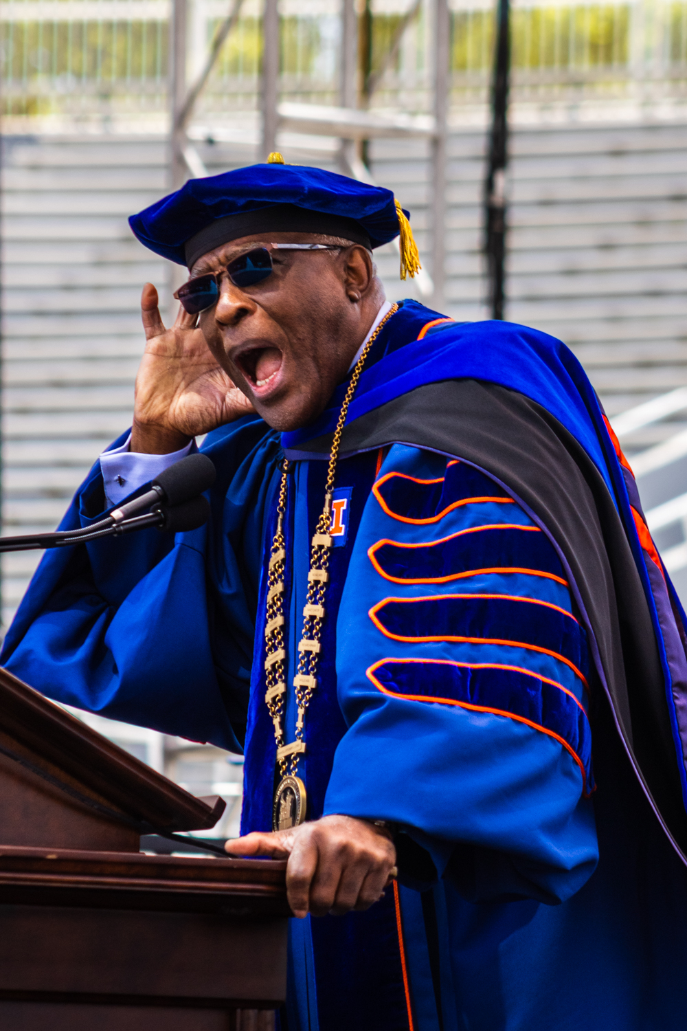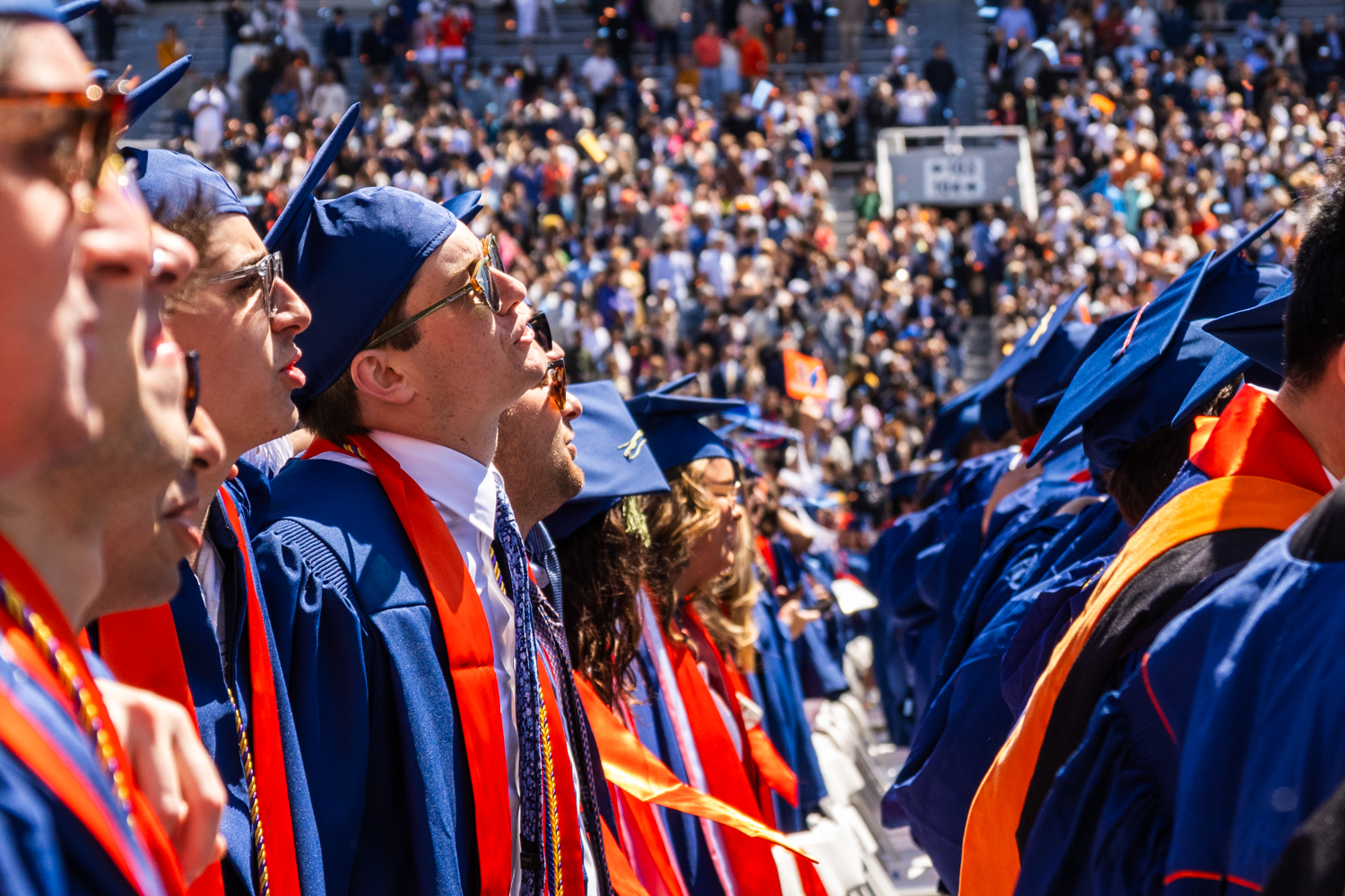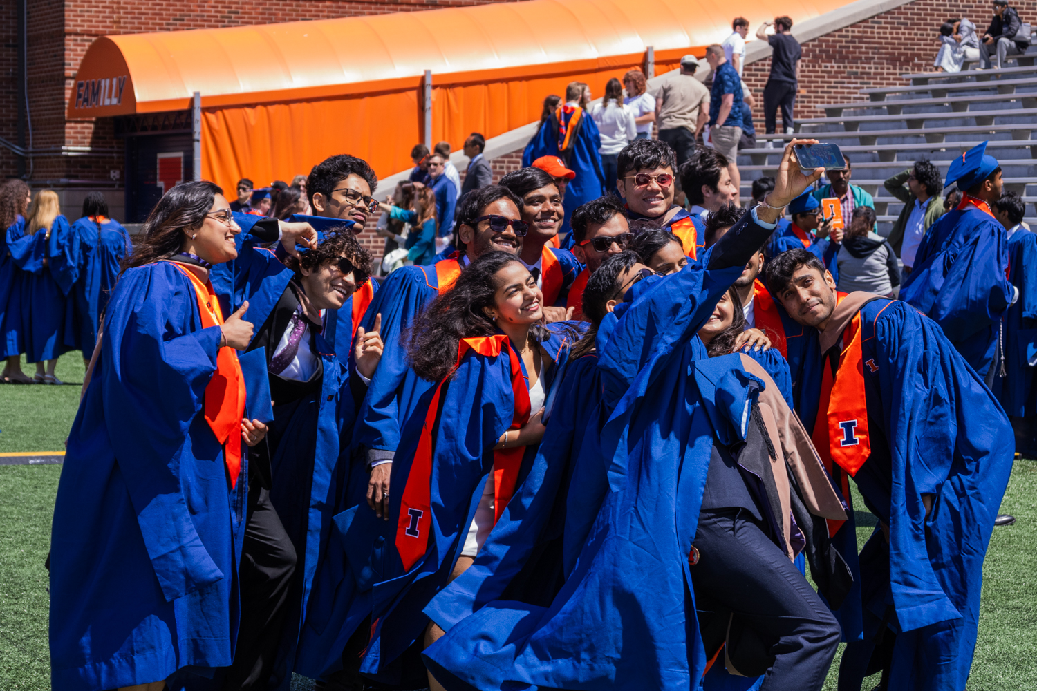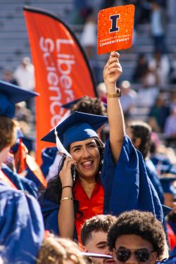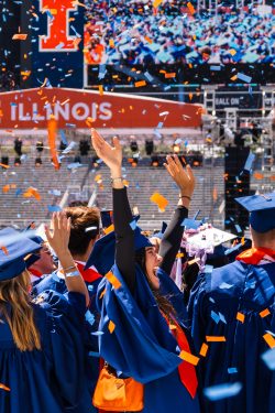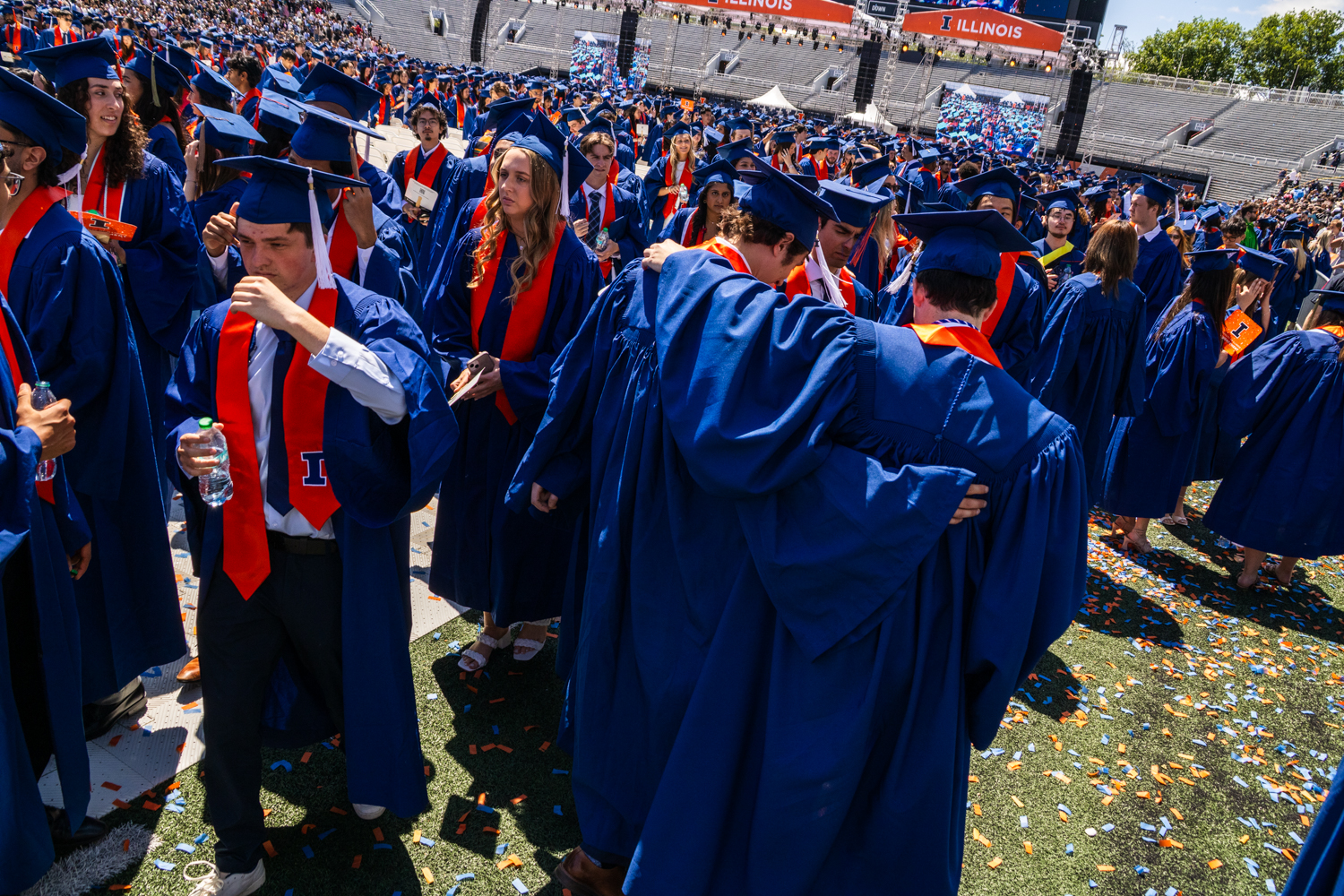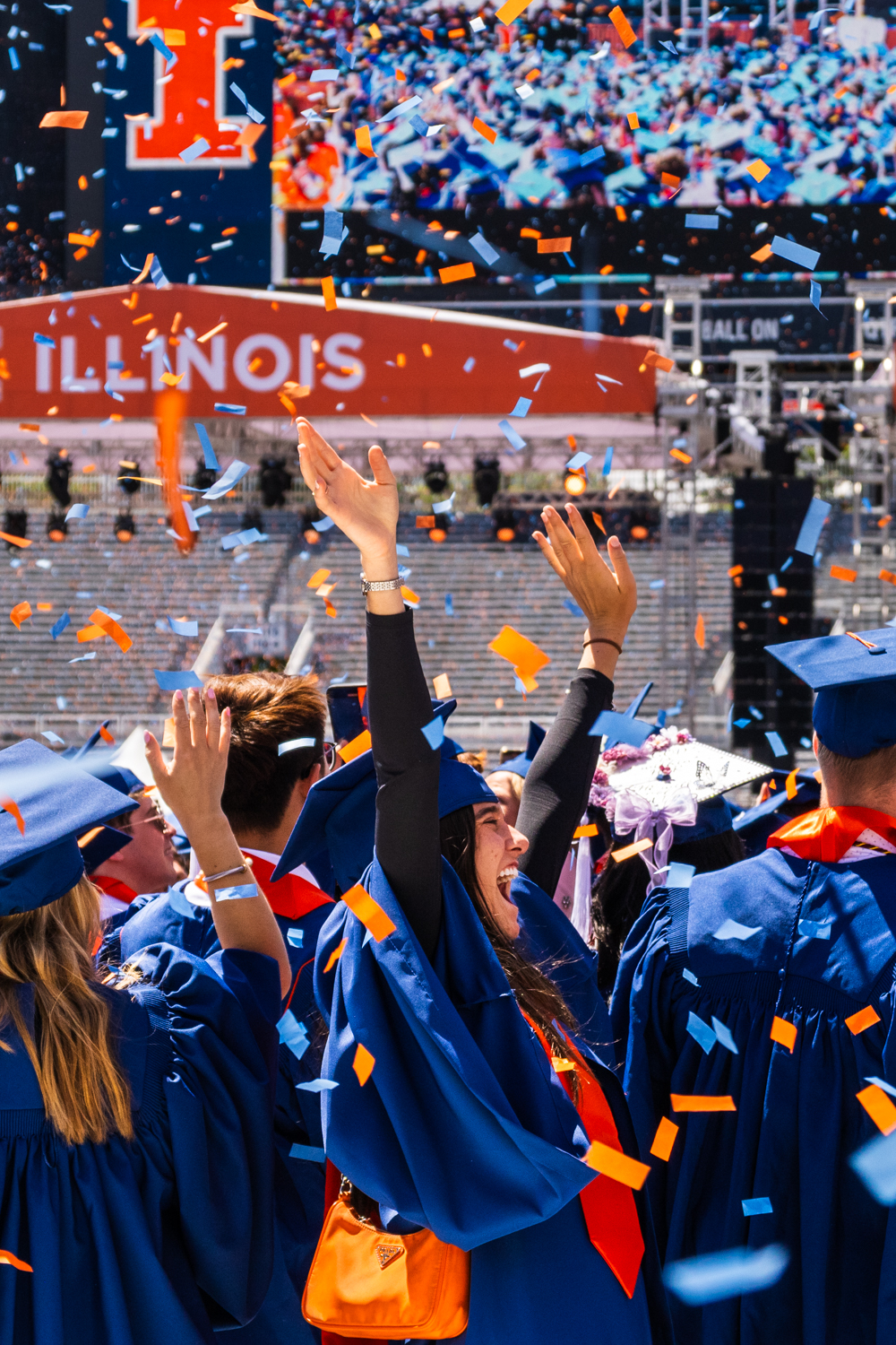 Newly graduated Illinois students link arms and sing “Hail to the Orange” to conclude the 2025 Illinois Commencement ceremony on May 17.