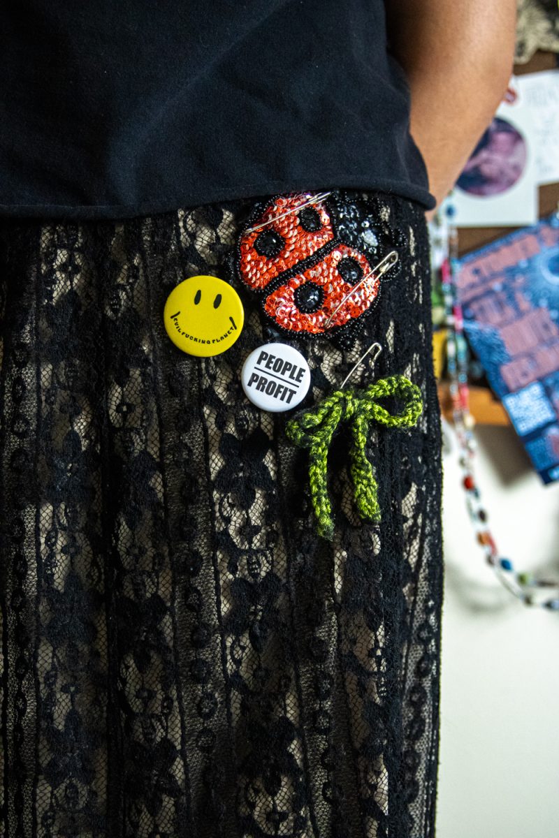 Martinez has a collection of pins that feature in her outfits. She said they put her inner thoughts into words.