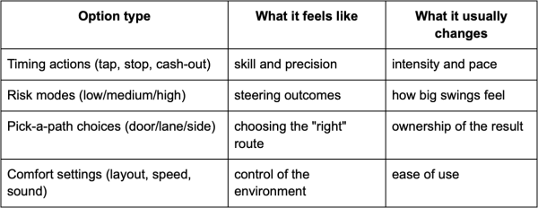 Before the table, one key idea: most options do not change luck. They change rhythm, comfort, or how intense the swings feel.