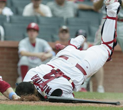 Molina got spun around on a one-hop throw from first baseman Chris Duncan, who had been playing in when he fielded Phillies star Jimmy Rollins’ bad-hop grounder. As he was turning to make the tag, Molina was drilled by pinch-runner Eric Bruntlett and he was face down in the dirt for several minutes while being attended to by medical personnel.