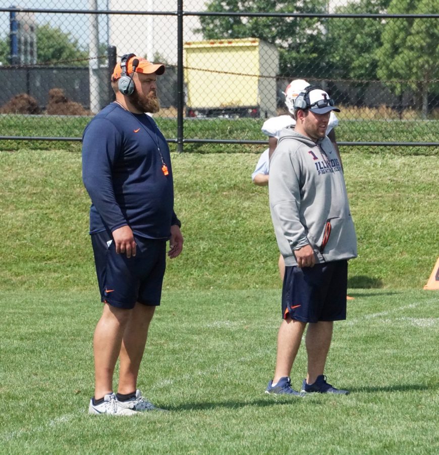 Illinois offensive line coach Luke Butkus (left) and defensive line coach Austin Clark (right) watch their players at Illinois football training camp on Aug. 9. Butkus will be leaving Illinois to join the Green Bay Packers as assistant offensive line coach.