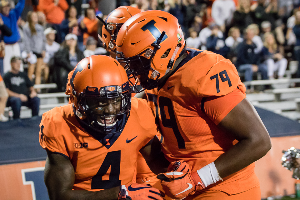Illinois wide receiver Ricky Smalling (4) celebrates with offensive lineman Vederian Lowe (79) after scoring a touchdown during the game against Penn State at Memorial Stadium on Friday, Sept. 21, 2018. The Illini lost 63-24.