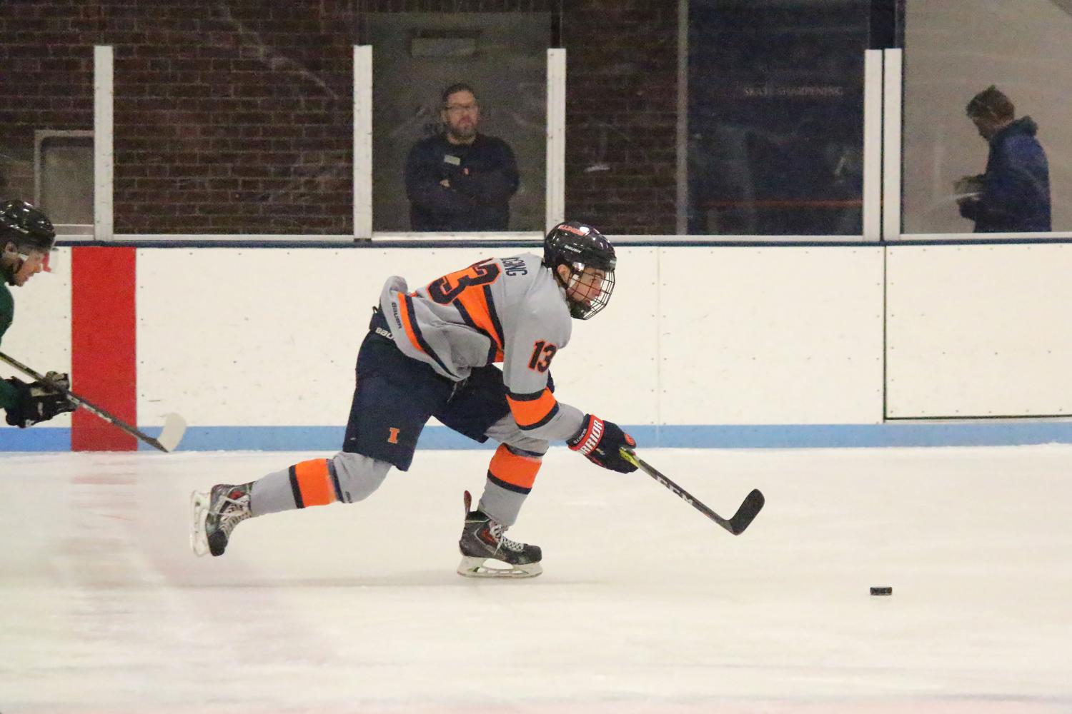 James McGing (13) skates down the ice in a breakaway against the Chicago Cougars at the Ice Arena on Friday, Dec. 9, 2016.