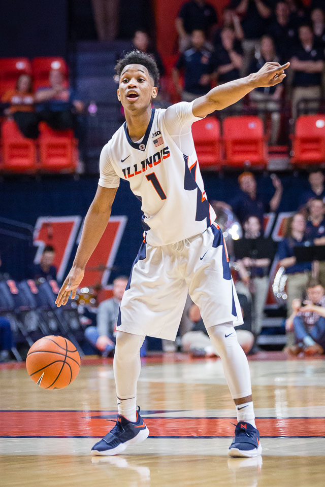 Illinois guard Trent Frazier (1) calls out a play during the game against Iowa at State Farm Center on Thursday, Jan. 11, 2018.