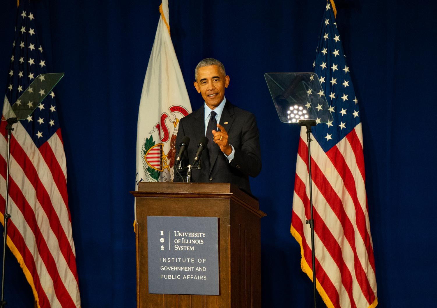 Former President Barack Obama speaks to students, faculty and community members during his acceptance of the Paul H. Douglas Award for Ethics in Government on Friday in Foellinger Auditorium.